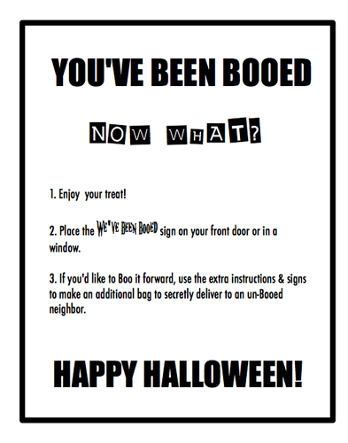 Boo baskets are baskets filled with fun goodies (given anonymously), accompanied by a 'boo poem' that creates a chain of anonymous boo baskets to be given (and received) by (hopefully).